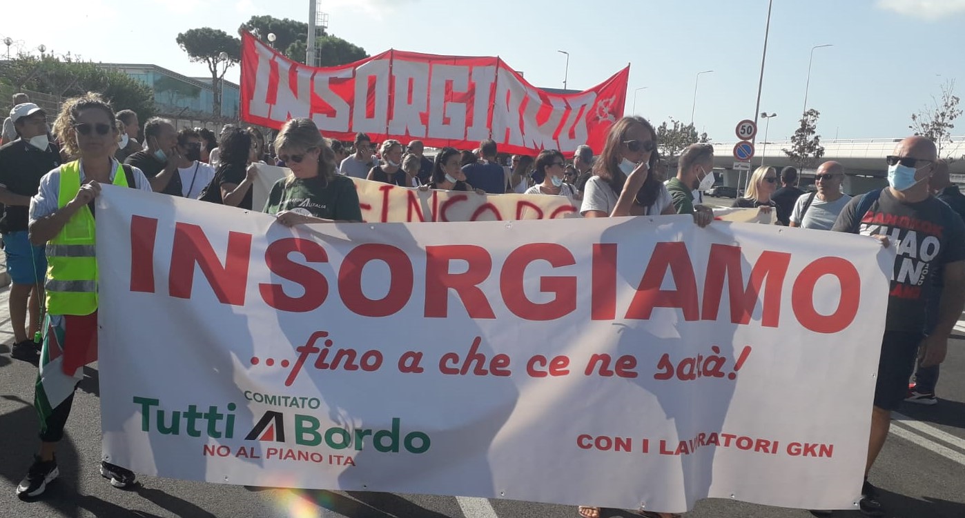 Come lavoratori e lavoratrici Alitalia ci è sembrato doveroso rispondere ed estendere l’appello che gli operai Gkn hanno rivolto a tutto il mondo del lavoro: Insorgiamo! Sì, perché ci sentiamo parte integrante ed attiva non di uno slogan, ma di una necessità che riguarda tutti i lavoratori e le lavoratrici: unirsi per respingere gli attacchi che stiamo subendo da decenni dai governi e dai padroni, all’interno di un sistema che è esclusivamente volto alla tutela dei profitti di poche decine di milionari, portando alla miseria milioni di lavoratori e devastando l'intero pianeta fino alla sua distruzione.Alcune centinaia di operai organizzati in un collettivo di fabbrica hanno dato un esempio di lotta a un intero Paese, non solo per difendersi dall’ennesima delocalizzazione imposta da fondi e multinazionali, ma per tentare di costruire i necessari rapporti di forza che da troppo tempo sono evidentemente a nostro sfavore: se restiamo isolati e divisi - come vorrebbe la stragrande maggioranza delle direzioni sindacali - continueremo a restare deboli e perdenti di fronte ad ogni tipo di attacco, che sia una delocalizzazione, una ristrutturazione aziendale, un cambio di appalto o un semplice rinnovo contrattuale.